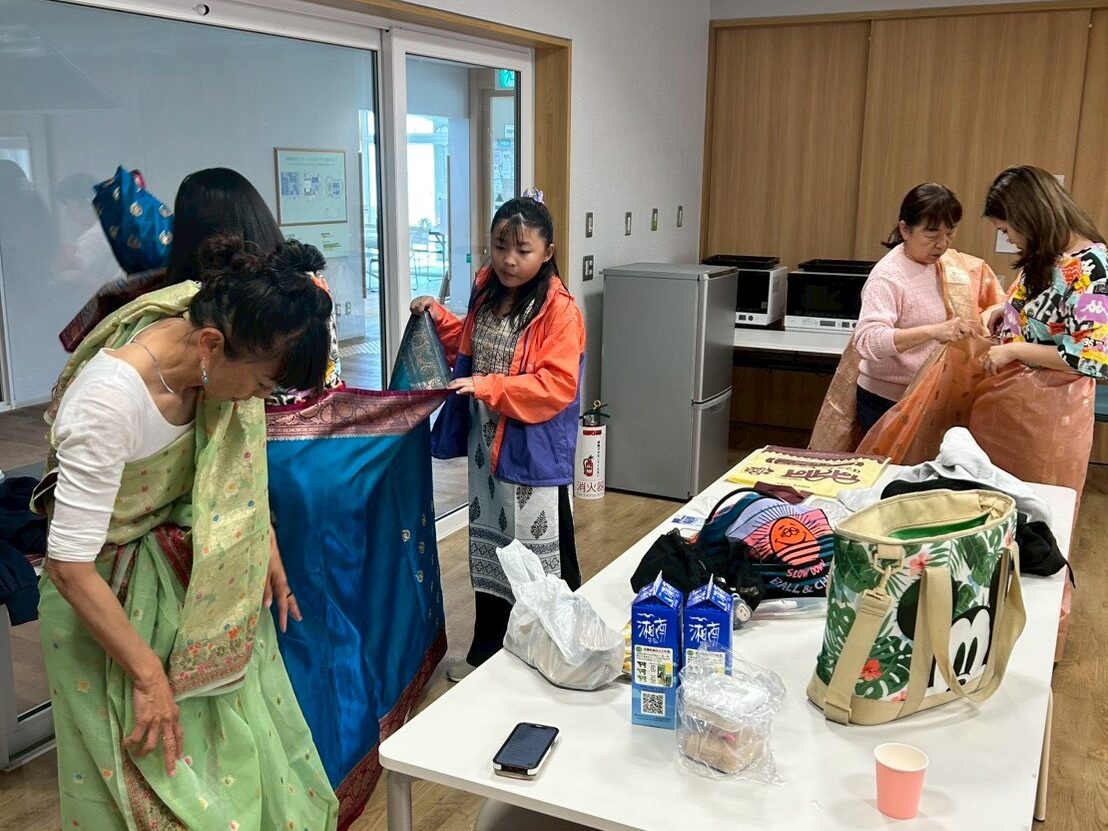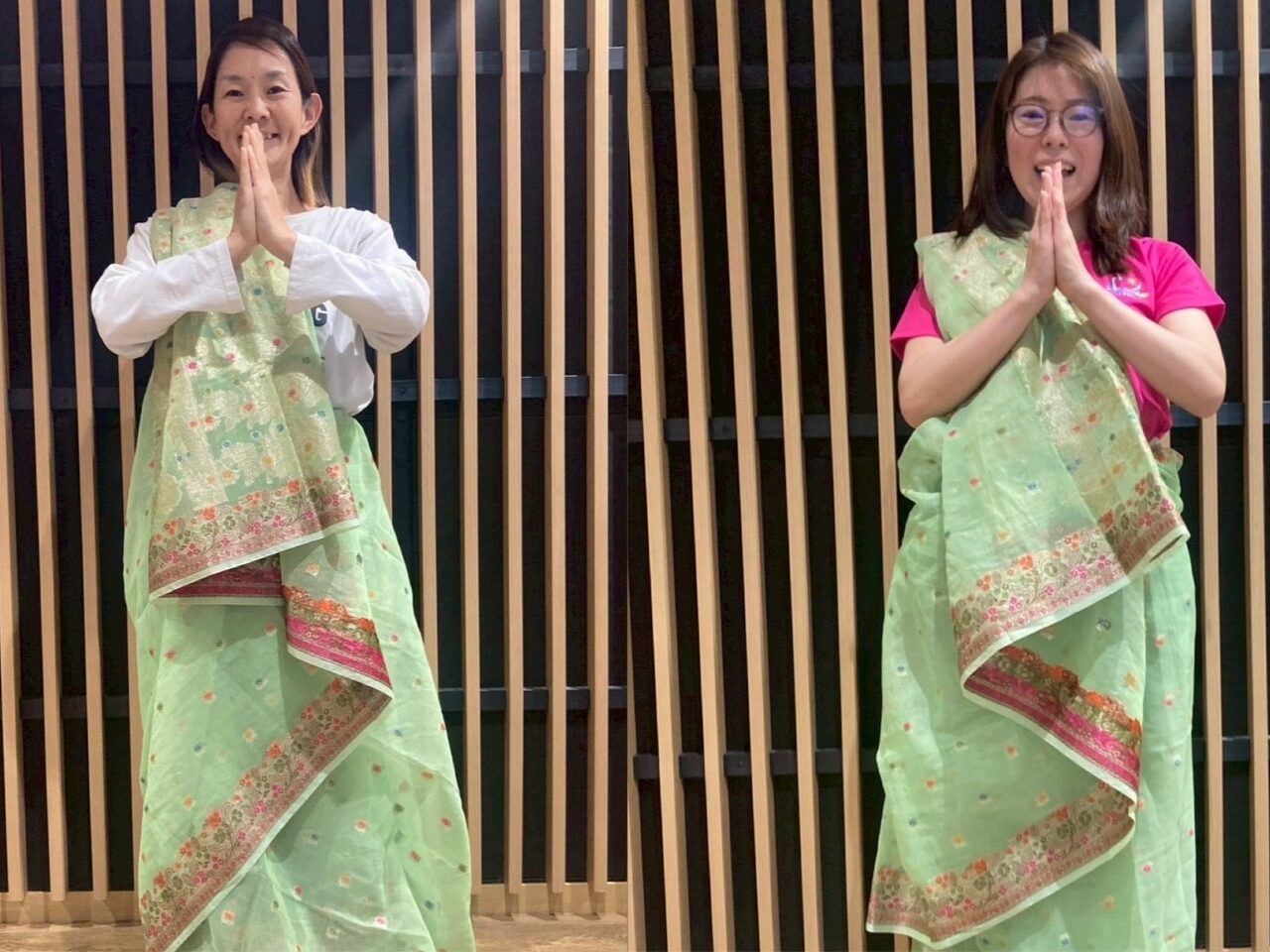 ヘナ待ちをしている女性陣の皆さんにサリー体験をしてもらったり、、